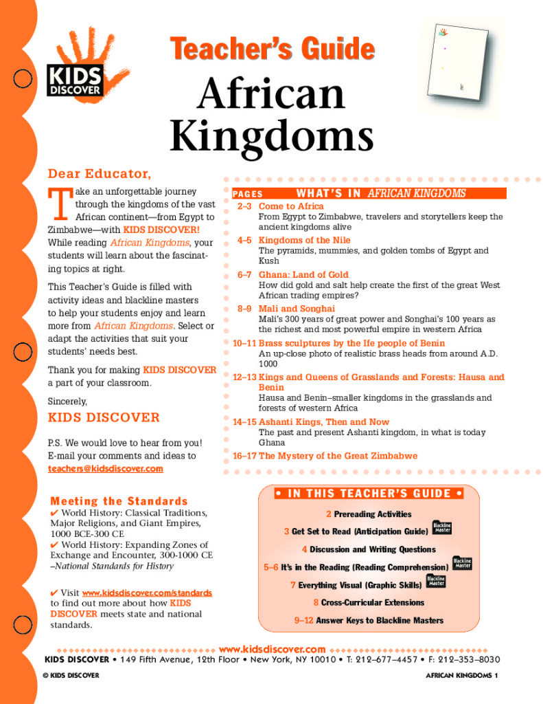 This free Lesson Plan on Kids Discover African Kingdoms will help kids learn all about the breathtaking pyramids and temples, feathered and painted armies, and other extravagances of the greatest African Kingdoms.